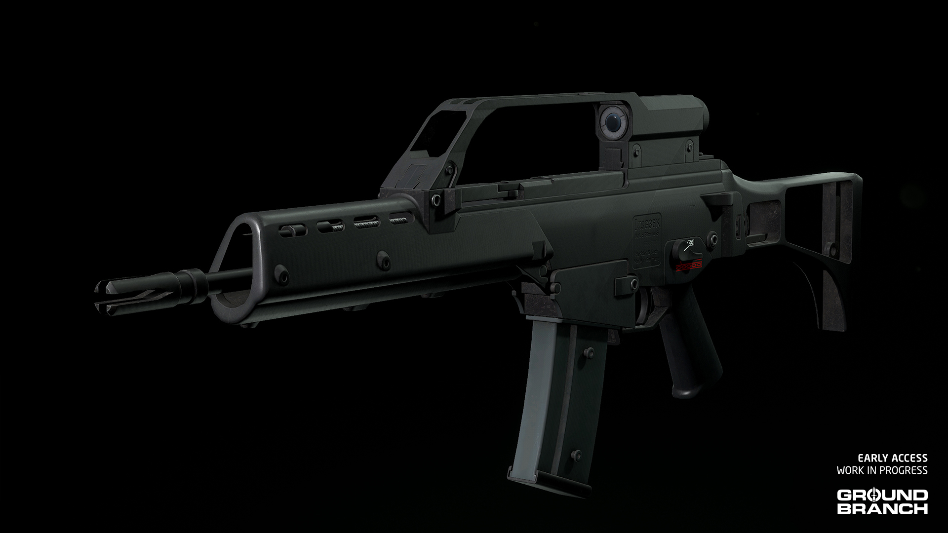 The original (“stock”) G36K joins its aftermarket version in the armory. Instead of the top accessory rail, this carbine comes with the original 3x scope built into the carry handle.