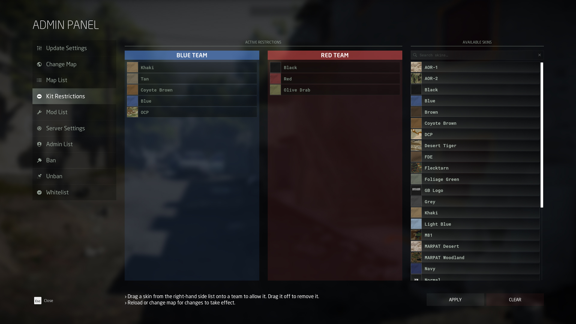 Although the refactoring didn’t allow us to rebuild kit restrictions the way we wanted them just yet, you can once again apply skin restrictions per team (Red and Blue) by going into Admin Panel › Kit Restrictions.